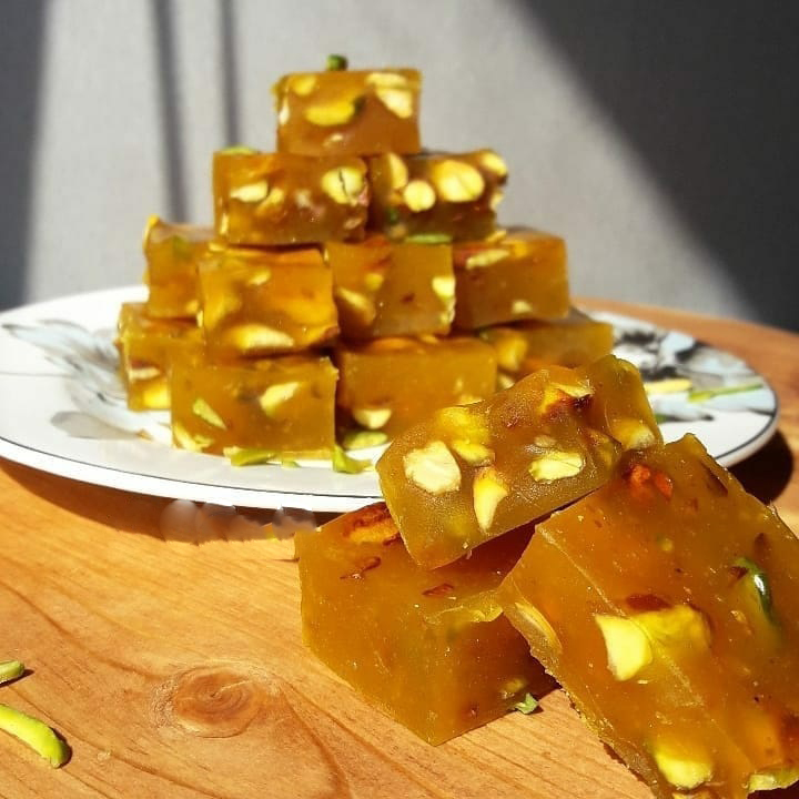 طرز تهیه حلوا مسقطی لاری با پودر نشاسته و گردو: